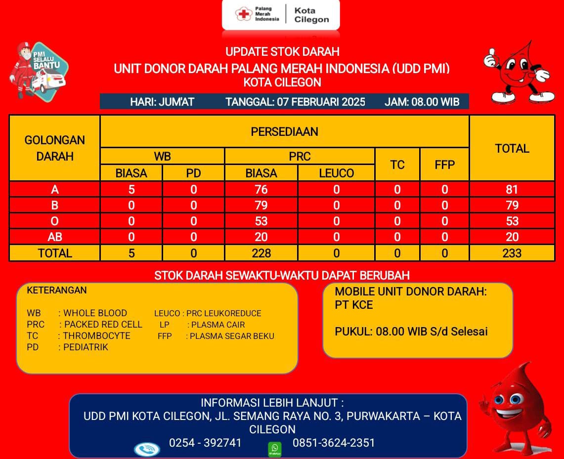 Sosial Info Ketersediaan Darah Di UDD PMI Oleh: Langit Cilegon 7 Februari 2025 7 Februari 2025 309 views A+A- Reset BAGIKAN 0FacebookTwitterWhatsappTelegramThreadsBluesky 309 Info ketersediaan darah di UDD PMI Cilegon, Jumat, 7 Februari 2025. REKOMENDASI BERITA Bentuk Kepedulian, Komunitas Sayang Cilegon Buka Cuci Gratis,... Breaking News, PNKT Gelar Temu Karya Karang Taruna... Langsung ke Rumah Warga, Istri Wali Kota Cilegon... Masjid Nurul Ikhlas dan Baznas Gelar Khitanan Massal,... KAISAR Peduli Banjir Cilegon, Salurkan Bantuan ke Posko... Puluhan Pengurus PCNU Kota Cilegon Esok Dilantik, Ini... Hari Lingkungan Hidup Sedunia 2025, Ini yang Di... Beredar Video Pelantikan KNPI Cilegon Terjadi Perdebatan, Ini... Ratusan Kader Gerindra Cilegon Lakukan Bersih-Bersih Pantai Mabak,... Pemenang Grandprize Mobil Asal Tegal Cabe Sumarni Bermimpi... TINGGALKAN KOMENTAR Cancel Reply Save my name, email, and website in this browser for the next time I comment. Δ