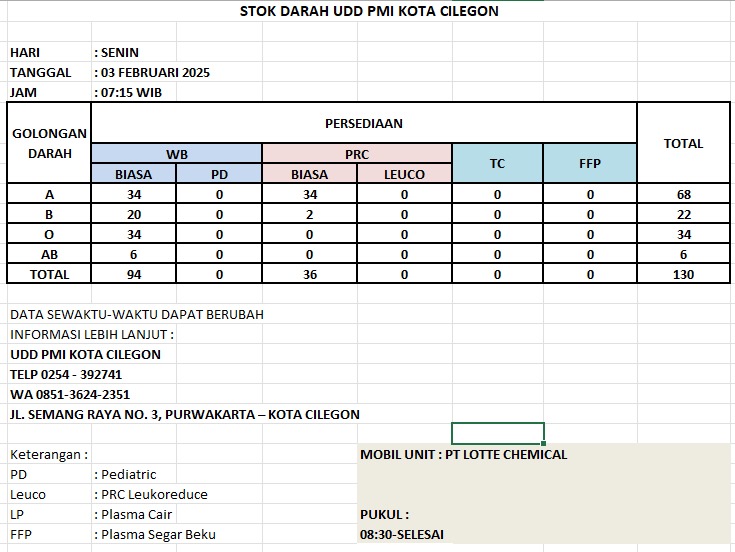 Sosial Info Ketersediaan Darah Hari Ini Oleh: Langit Cilegon 3 Februari 2025 3 Februari 2025 335 views A+A- Reset BAGIKAN 0FacebookTwitterWhatsappTelegramThreadsBluesky 335 Info Ketersediaan Darah Hari Ini, Senin, 3 Februari 2025. REKOMENDASI BERITA Bentuk Kepedulian, Komunitas Sayang Cilegon Buka Cuci Gratis,... Masjid Nurul Ikhlas dan Baznas Gelar Khitanan Massal,... Langsung ke Rumah Warga, Istri Wali Kota Cilegon... Ratusan Kader Gerindra Cilegon Lakukan Bersih-Bersih Pantai Mabak,... Breaking News, PNKT Gelar Temu Karya Karang Taruna... KAISAR Peduli Banjir Cilegon, Salurkan Bantuan ke Posko... Puluhan Pengurus PCNU Kota Cilegon Esok Dilantik, Ini... Hari Lingkungan Hidup Sedunia 2025, Ini yang Di... Beredar Video Pelantikan KNPI Cilegon Terjadi Perdebatan, Ini... Mulai Besok Penumpang Kereta Api Dari Rangkasbitung Bakal... TINGGALKAN KOMENTAR Cancel Reply Save my name, email, and website in this browser for the next time I comment. Δ