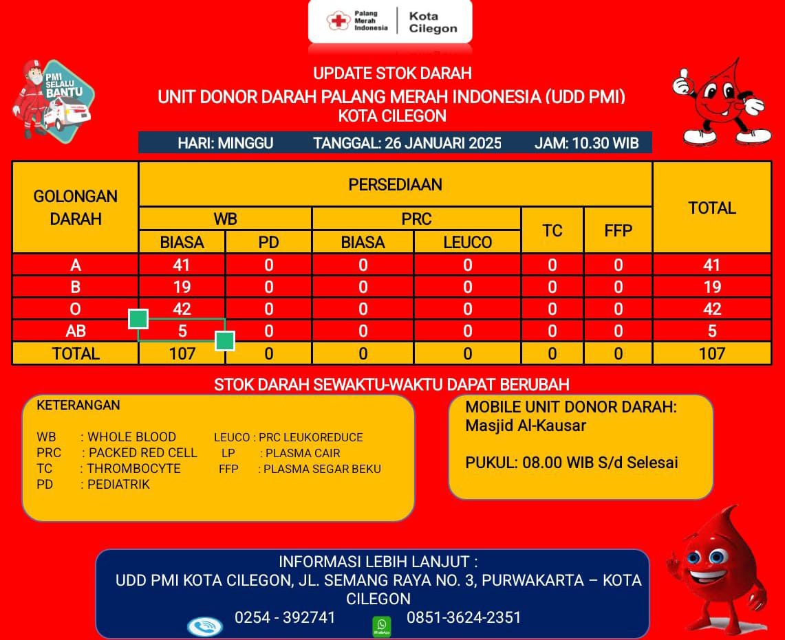 Sosial Info Ketersediaan Darah Hari Ini Oleh: Langit Cilegon 26 Januari 2025 26 Januari 2025 453 views A+A- Reset BAGIKAN 0FacebookTwitterWhatsappTelegramThreadsBluesky 453 Info ketersediaan darah di UDD PMI Cilegon, Minggu, 26 Januari 2025. REKOMENDASI BERITA Beredar SK Karang Taruna Cilegon Di Jabat Careteker,... PMI Kota Cilegon Salurkan Bantuan Dana dan Sembako... GOW Kota Cilegon Gelar Pelatihan Public Speaking untuk... Tiga Pengurus Forward jadi Narsum Diklat Jurnalistik Pramuka... IKA-KMC Gelar Mubes III, Ini Ketua Periode 2025-2028 Puluhan Pengurus PCNU Kota Cilegon Esok Dilantik, Ini... SMSI Kota Cilegon Periode 2025–2028 Resmi Dilantik Pemenang Grandprize Mobil Asal Tegal Cabe Sumarni Bermimpi... Warga Yang Tersesat di Gunung Cipala Ditemukan Oleh... Didampingi Pengurus PWI Wakil Wali Kota Cilegon Besuk... TINGGALKAN KOMENTAR Cancel Reply Save my name, email, and website in this browser for the next time I comment. Δ