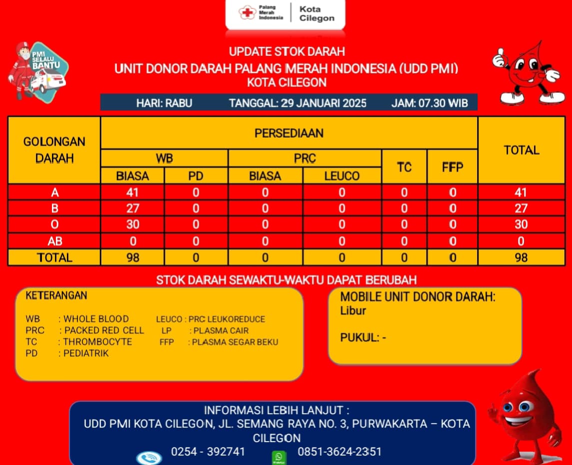 Sosial Info Ketersediaan Darah UDD PMI Cilegon Oleh: Langit Cilegon 29 Januari 2025 29 Januari 2025 524 views A+A- Reset BAGIKAN 0FacebookTwitterWhatsappTelegramThreadsBluesky 524 Info Ketersediaan darah dinUDD PMI Cilegon, Rabu, 28 Januari 2025. REKOMENDASI BERITA Bentuk Kepedulian, Komunitas Sayang Cilegon Buka Cuci Gratis,... Langsung ke Rumah Warga, Istri Wali Kota Cilegon... Masjid Nurul Ikhlas dan Baznas Gelar Khitanan Massal,... Ratusan Kader Gerindra Cilegon Lakukan Bersih-Bersih Pantai Mabak,... Breaking News, PNKT Gelar Temu Karya Karang Taruna... KAISAR Peduli Banjir Cilegon, Salurkan Bantuan ke Posko... HNSI Cilegon Periode 2024-2029 Dilantik, Ini Visi Dan... Puluhan Pengurus PCNU Kota Cilegon Esok Dilantik, Ini... Hari Lingkungan Hidup Sedunia 2025, Ini yang Di... Beredar Video Pelantikan KNPI Cilegon Terjadi Perdebatan, Ini... TINGGALKAN KOMENTAR Cancel Reply Save my name, email, and website in this browser for the next time I comment. Δ