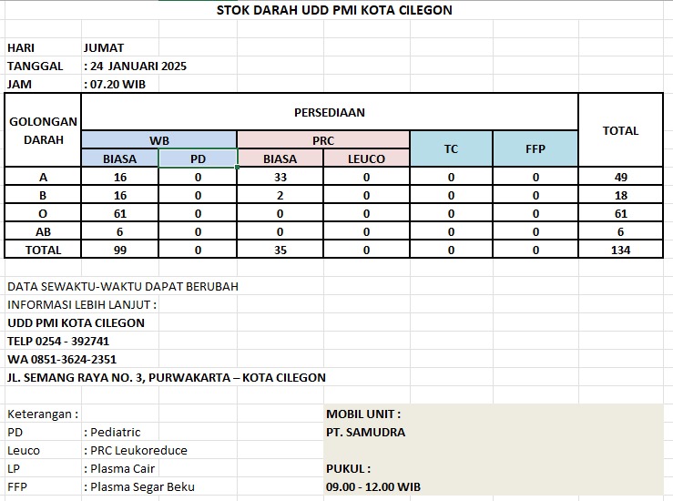 Sosial Info Stok Darah Di PMI Kota Cilegon Oleh: Langit Cilegon 24 Januari 2025 24 Januari 2025 480 views A+A- Reset BAGIKAN 0FacebookTwitterWhatsappTelegramThreadsBluesky 480 Info Stok Darah PMI Kota Cilegon, Jumat 24 Januari 2025 REKOMENDASI BERITA Bentuk Kepedulian, Komunitas Sayang Cilegon Buka Cuci Gratis,... Langsung ke Rumah Warga, Istri Wali Kota Cilegon... Ratusan Kader Gerindra Cilegon Lakukan Bersih-Bersih Pantai Mabak,... Breaking News, PNKT Gelar Temu Karya Karang Taruna... Masjid Nurul Ikhlas dan Baznas Gelar Khitanan Massal,... KAISAR Peduli Banjir Cilegon, Salurkan Bantuan ke Posko... HNSI Cilegon Periode 2024-2029 Dilantik, Ini Visi Dan... Puluhan Pengurus PCNU Kota Cilegon Esok Dilantik, Ini... Hari Lingkungan Hidup Sedunia 2025, Ini yang Di... Beredar Video Pelantikan KNPI Cilegon Terjadi Perdebatan, Ini... TINGGALKAN KOMENTAR Cancel Reply Save my name, email, and website in this browser for the next time I comment. Δ
