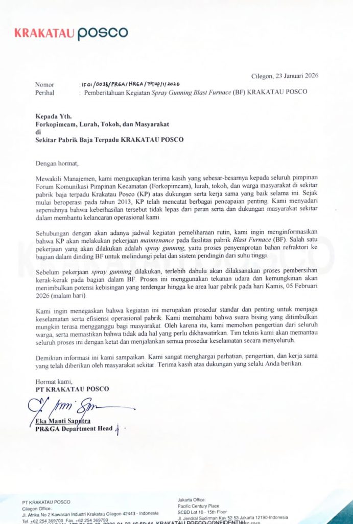 Sebelumnya diketahui, beredar surat edaran tentang adanya kegiatan maintenance yang dilakukan oleh PT.Krakatau Posco. Yang isinya sebagai berikut.:
